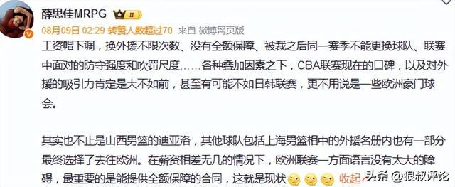 媒體人付政浩曾發(fā)文點(diǎn)評(píng):工資帽下調(diào),換外援不限次數(shù)、沒有全額保障、被裁之后同一賽季不能更換球隊(duì)、聯(lián)賽中面對(duì)的防守強(qiáng)度和吹罰尺度……各種疊加因素之下,CBA聯(lián)賽現(xiàn)在的口碑,以及對(duì)外援的吸引力肯定是大不如前,甚至有可能不如日韓聯(lián)賽,更不用說是一些歐洲豪門球會(huì)。