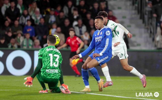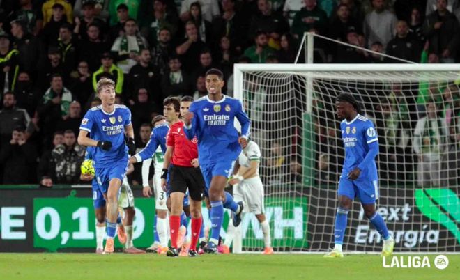 利用角球機(jī)會(huì),皇馬制造埃爾切門前的混亂,貝林厄姆奮力爭(zhēng)頂,赫伊森化身帶刀侍衛(wèi),打進(jìn)加盟皇馬的首個(gè)進(jìn)球。