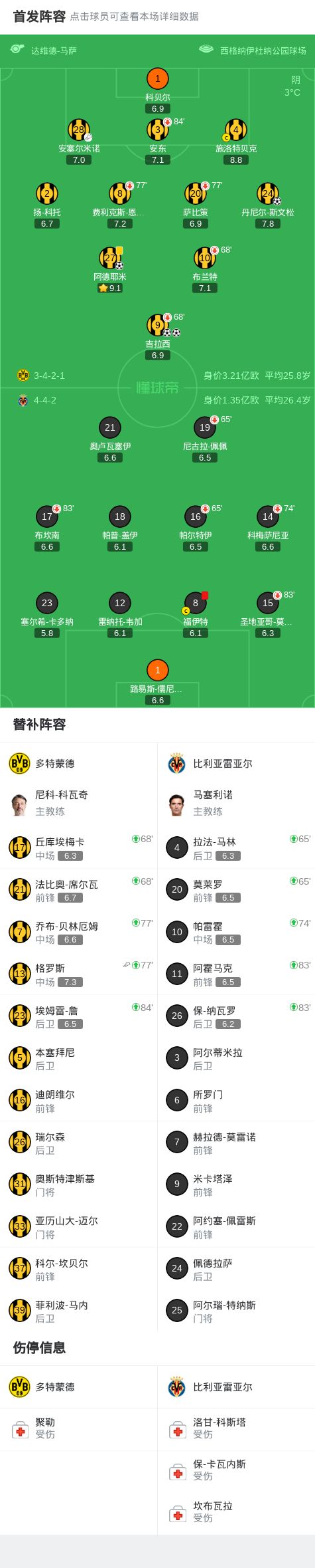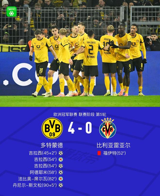 北京時(shí)間11月26日4:00,歐冠聯(lián)賽階段第5輪,多特蒙德坐鎮(zhèn)西格納-伊杜納公園球場(chǎng)迎戰(zhàn)比利亞雷亞爾,本場(chǎng)主裁判為達(dá)維德-馬薩。上半場(chǎng),安塞爾米諾助攻吉拉西頭球破門。下半場(chǎng),福伊特門線手球吃到紅點(diǎn)套餐,吉拉西主罰點(diǎn)球被撲后自己補(bǔ)射破門梅開(kāi)二度,緊接著阿德耶米破門后又造點(diǎn),法比奧-席爾瓦失點(diǎn),斯文松補(bǔ)時(shí)錦上添花。最終,多特主場(chǎng)4-0大勝十人黃潛。