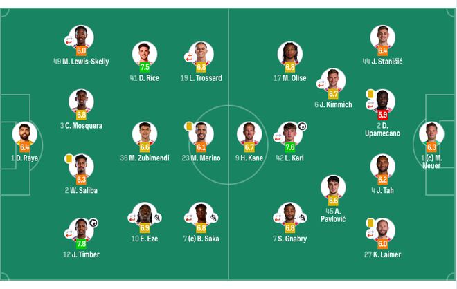 第15分鐘,諾伊爾果斷出擊,頭球解圍后,撞到了薩卡的鼻子,造成了薩卡出血立即接受治療。