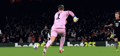 第9分鐘,諾伊爾的傳球直接被薩利巴截?cái)?,但薩利巴展現(xiàn)了后衛(wèi)的腳法,又把球傳了回去。