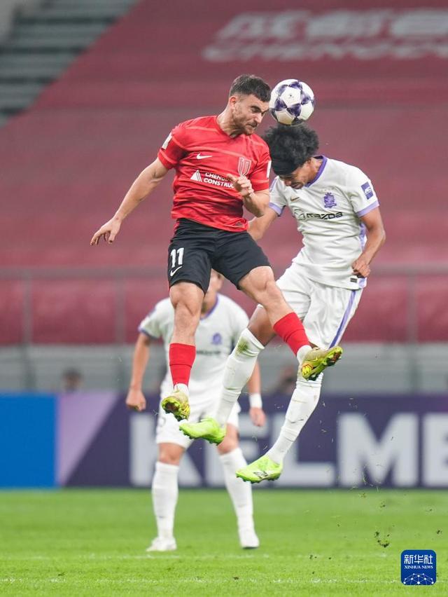 11月25日,成都蓉城隊球員古爾芬克爾(左)在比賽中爭頂頭球。新華社記者 王曦 攝