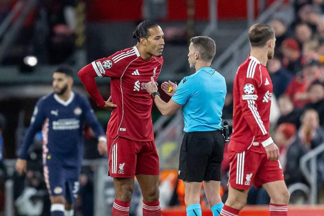 第4分鐘,埃因霍溫角球機(jī)會(huì)罰向禁區(qū),范戴克“攔網(wǎng)”動(dòng)作將球攔下,主裁判罰點(diǎn)球,佩里西奇主罰命中,埃因霍溫1-0利物浦。
