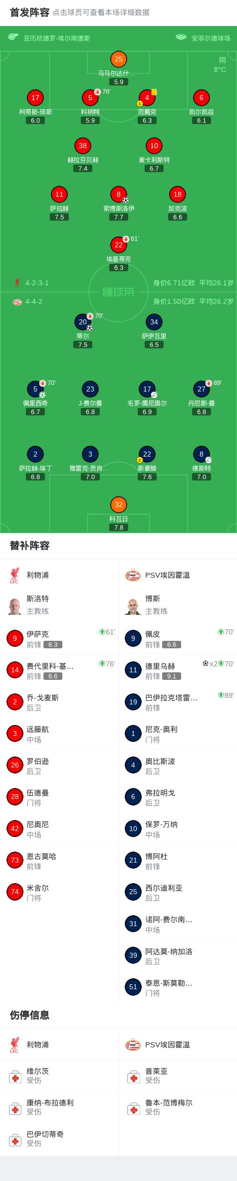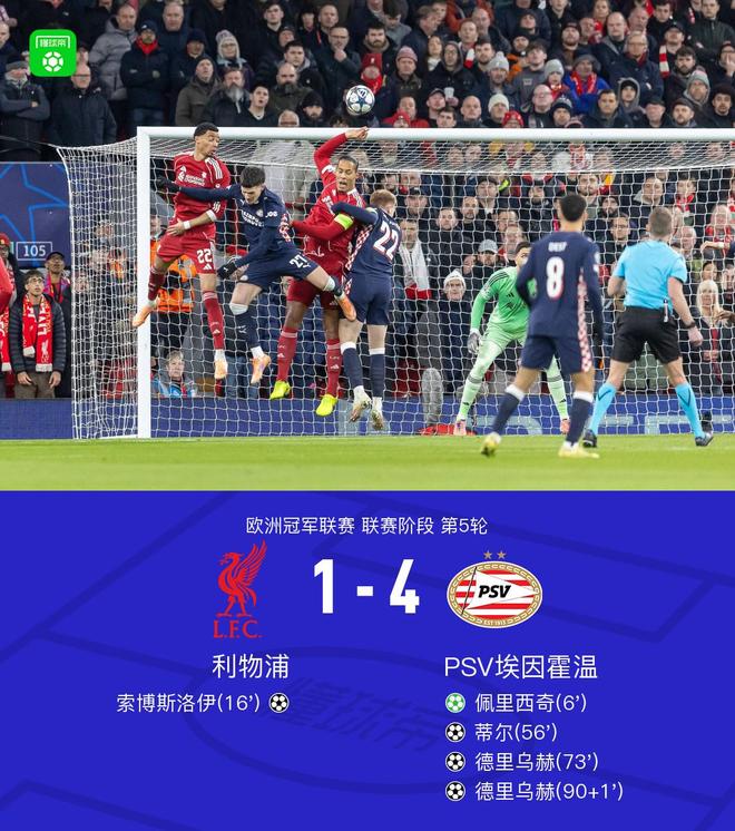 北京時間11月27日,歐洲冠軍聯(lián)賽聯(lián)賽階段第5輪展開較量,利物浦迎戰(zhàn)PSV埃因霍溫。比賽伊始,PSV埃因霍溫通過點球率先取得進(jìn)球,佩里西奇主罰命中,為球隊打開局面。隨后,利物浦由索博斯洛伊抓住機會扳平比分。進(jìn)入下半場,PSV埃因霍溫持續(xù)施壓,毛羅-儒尼奧爾送出助攻,蒂爾推射得手再度將比分超出。之后,德里烏赫突破防守打入一球,進(jìn)一步擴大領(lǐng)先優(yōu)勢。臨近結(jié)束前,德斯特送出精準(zhǔn)傳球,德里烏赫冷靜破門完成梅開二度。最終,全場比分定格為利物浦 1-4 PSV埃因霍溫。